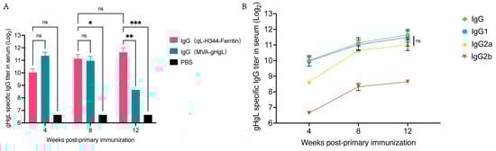 Serum-specific antibody levels induced by the gL-gH344-Ferritin and MVA-gHgL vaccines in mice. (A) titers of specific immunoglobulin G (IgG) antibodies induced by the gL-gH344-Ferritin and MVA-gHgL vaccines as determined using enzyme-linked immunosorbent assay (ELISA); * p < 0.05; ** p < 0.01; *** p < 0.001; ns indicates no significant difference. (B) titers of specific IgG, IgG1, IgG2a, and IgG2b antibodies induced by the gL-gH344-Ferritin vaccines as determined using ELISA. Statistical analysis was performed using two-way ANOVA to evaluate significant differences. ns indicates no significant difference.