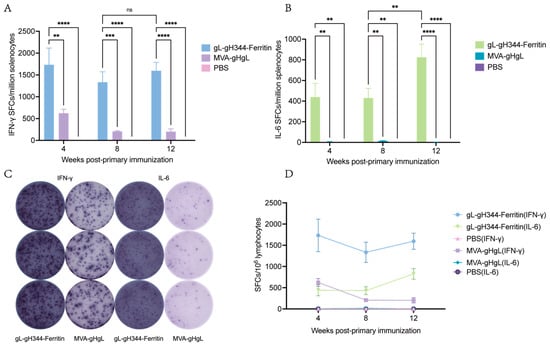 Induction of EBV-gH/gL-specific cellular immunity by the gL-gH344-Ferritin and MVA-gHgL vaccines in mouse splenic lymphocytes. (A) levels of interferon (IFN)-γ secretion from mouse splenic lymphocytes induced by the gL-gH344-Ferritin and MVA-gHgL vaccines, as determined using enzyme-linked immunospot (ELISpot) assay. (B) levels of interleukin (IL)-6 secretion from mouse splenic lymphocytes induced by the gL-gH344-Ferritin and MVA-gHgL vaccines, as determined using ELISpot assay. Data were analyzed using two-way ANOVA to evaluate significant differences. ** p < 0.01; *** p < 0.001; **** p < 0.0001; ns indicates no significant difference. (C) representative ELISpot images showing IFN-γ or IL-6 secretion from mouse splenic lymphocytes induced by the gL-gH344-Ferritin and MVA-gHgL vaccines. (D) weekly comparison of IFN-γ and IL-6 levels among the gL-gH344-Ferritin, MVA-gHgL, and PBS control groups.