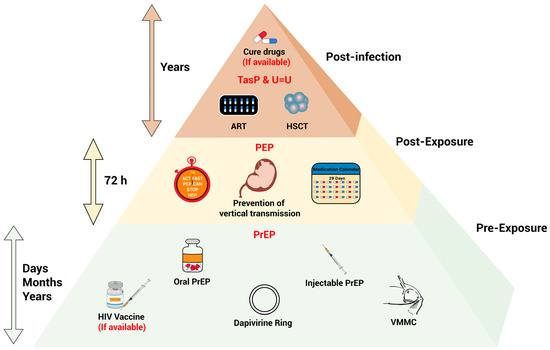 Biomedical intervention strategies for HIV prevention and control. All biomedical intervention strategies are categorized based on the different stages of HIV exposure. The different colors represent distinct stages of HIV exposure, ordered from bottom to top: pre-exposure, post-exposure, and post-infection. The arrows indicate the duration of each stage. In general, with more earlier stages of virus exposure, more intervention measures are available and effective against HIV infections. TasP and U=U: treatment as prevention and undetectable = untransmittable; ART: antiretroviral therapy; HSCT: haematopoietic stem cell transplantation; PEP: post-exposure prophylaxis; PrEP: pre-exposure prophylaxis; VMMC: voluntary medical male circumcision.