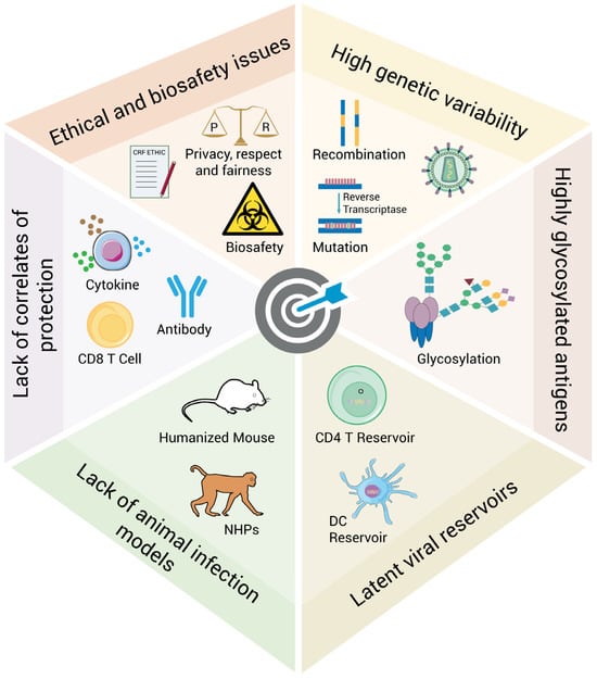 Challenges for the development of biomedical interventions against HIV infections. On the right half are the challenges posed by the characteristics of HIV itself, including high genetic variability, highly glycosylated antigens, and latent viral reservoirs. On the left half are the challenges created by the limitations of technologies, including the lack of animal infection models, and the correlates of protection, ethical, and biosafety issues. NHPs: non-human primates, DC: dendritic cell.