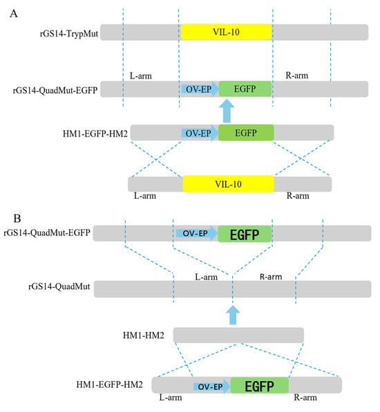 (A) Schematic diagram for the construction of rGS14-QuadMut-OV-EP-EGFP; (B) schematic diagram for the construction of rGS14-QuadMut.