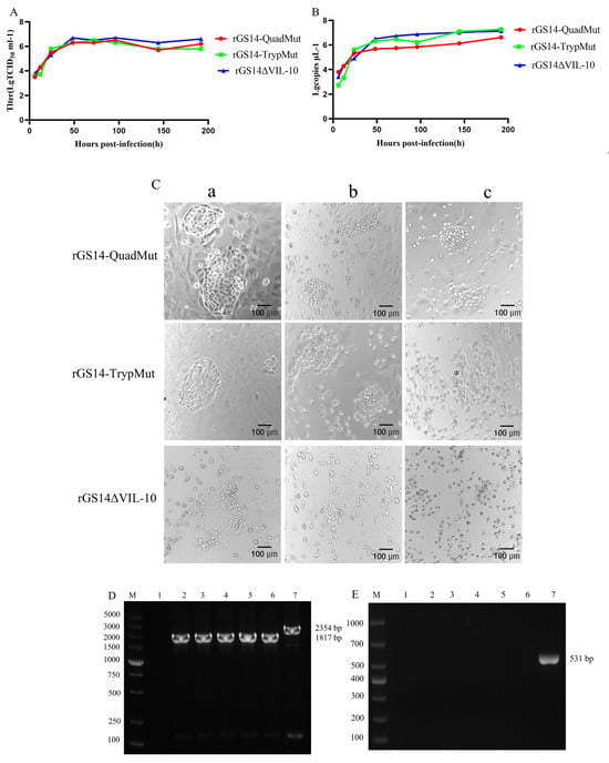 To determine half of the tissue culture infective dose (TCID50) of rGS14-QuadMut, rGS14-TrypMut, and rGS14∆VIL-10, each of the three recombinant viruses were seeded into a 96-well plate covered with a monolayer of PLT cells (8 wells of 100 μL per well at each dilution).After incubating at 37 °C with 5% CO2 for 2 h, the maintenance medium was added, and cells were cultured continuously. From day 4 onward, the number of wells exhibiting CPE was recorded, and the TCID50 was calculated using the Reed–Muench method.