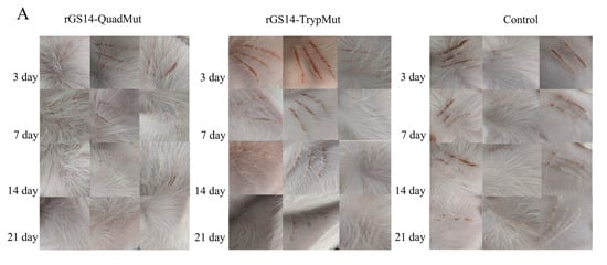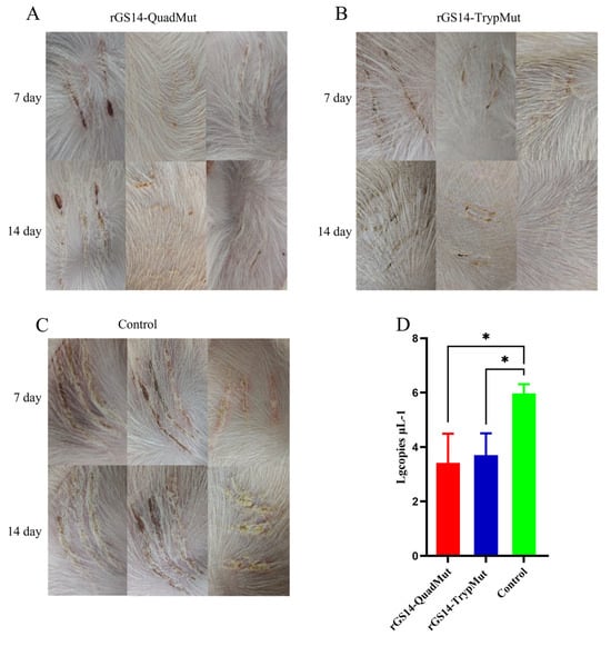 As shown in Figure 5, the control group that was scratched with the virus showed clear pustules at the inoculation site, which developed into scabs, displaying typical clinical symptoms of orf (CE). However, no typical clinical symptoms of orf were observed at the inoculation sites of lambs immunized with rGS14-QuadMut and rGS14-TrypMut. These results indicate that both rGS14-QuadMut and rGS14-TrypMut provide effective immune protection, preventing the development of typical clinical symptoms following challenge. The results of the qPCR showed that, compared with the control group, the viral content at the challenged sites in the rGS14-QuadMut and rGS14-TrypMut groups was lower, and there were significant differences (p < 0.05).