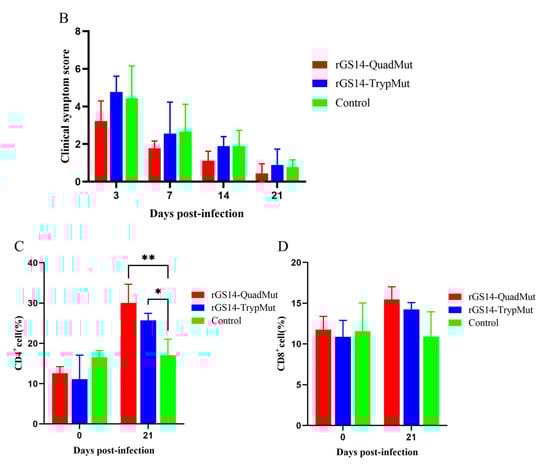 Clinical infection process of rGS14-QuadMut and rGS14-TrypMut. (A) Clinical characteristics of lambs immunized with rGS14-QuadMut, rGS14-TrypMut, and DMEM F12 at days 3, 7, 14, and 21 post-inoculation. In the rGS14-QuadMut-immunized group, dark red or brown scabs appeared at the inoculation site on day 3, with no significant inflammation. The wound healed completely by day 7. In contrast, lambs immunized with rGS14-TrypMut exhibited local hemorrhage and swelling at the injection site on day 3, with scabbing beginning on day 7 and the wound healing almost completely by day 14. Each column in the figure represents a separate laboratory animal (n = 1); (B) bar chart showing clinical symptom scores for lambs immunized with rGS14-QuadMut, rGS14-TrypMut, and DMEM F12; (C) flow cytometric analysis of the percentage of CD4+ T cells in the blood of lambs before (day 0) and after immunization (day 21); and (D) flow cytometric analysis of the percentage of CD8+ T cells in the blood of lambs before (day 0) and after immunization (day 21). * p < 0.05, ** p < 0.01.