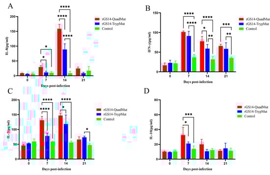 ELISA kits were used to detect the levels of cytokines of IL-2, IL-10, IL-8, and IFN-γ in the serum of experimental lambs at different time points. The results (Figure 4) show that compared to the DMEM F12 control group, IL-8 levels in rGS14-QuadMut and rGS14-TrypMut-immunized lambs did not increase significantly on day 7, but peaked on day 14, after which they declined. On day 14, IL-8 expression was significantly higher in the rGS14-QuadMut-immunized group compared to the rGS14-TrypMut group (p < 0.001). IFN-γ levels increased rapidly after immunization, reaching a peak on day 7, followed by a decline. Compared to the control group, IFN-γ levels were significantly elevated in the rGS14-QuadMut-immunized group (p < 0.0001 or p < 0.001), and in the rGS14-TrypMut group, IFN-γ levels showed a significant increase on day 7 (p < 0.001), with significant differences on days 14 and 21 (p < 0.01). IL-2 levels increased slowly after immunization, peaking on day 14 before decreasing. The rGS14-QuadMut-immunized group showed significant increases in IL-2 levels on days 7 and 14, with a highly significant difference compared to the control group (p < 0.0001) and a significant difference compared to the rGS14-TrypMut group (p < 0.001 or p < 0.05). On day 21, IL-2 levels in the rGS14-TrypMut-immunized group increased significantly compared to the control group (p < 0.05). No significant difference was observed in the changes in IL-10 cytokine levels between the two immunized groups, but on day 7, IL-10 levels in the rGS14-TrypMut-immunized group were significantly higher than the control group (p < 0.05), while IL-10 levels in the rGS14-QuadMut-immunized group showed a highly significant increase (p < 0.001).