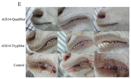 Stability, safety, and the capacity to generate an effective immune response are critical indicators for vaccines [,]. In previous studies, our laboratory compared the safety profiles of rGS14-TrypMut and the parental strain GS14, and the results demonstrate that the safety of rGS14-TrypMut was improved []. On this basis, in a safety comparison between rGS14-QuadMut and rGS14-TrypMut, using the same dose for scratching inoculation on the inner thigh of lambs, the results show that rGS14-QuadMut lambs were more clinically symptomatic and had a shorter healing time, showing a better safety profile. Deletion of the VIL-10 virulence gene effectively reduces viral virulence, which may be responsible for the reduction in local clinical symptoms.