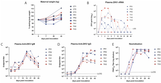 Maternal body weight was measured as a sign of disease and showed a steady increase in ZIKV-TH animals, which mirrored controls, as would be expected during pregnancy (Figure 2A). Compared to the ZIKV-PR, an average decrease in body weight was observed at 7 dpi and weight gain lagged behind until endpoint at 40 dpi. This was particularly pronounced in one animal (PR1) with a 6% reduction in body weight at 7 dpi and 28 dpi before returning to baseline at 40 dpi. The duration of maternal viremia is considered an important factor contributing to transplacental dissemination and could contribute to clinical symptoms such as weight loss [62]. Maternal viremia kinetics were measured by qRT-PCR for both ZIKV-PR- and ZIKV-TH-infected animals. Two of three animals in each group had detectable ZIKV vRNA in plasma by 1-day post-infection (dpi) and reached peak plasma viral load between 1 and 3 dpi (mean time to peak was 2 dpi) (Figure 2B and Figure S1). ZIKV plasma viremia was resolved by 14 dpi in all animals, with sporadic positive detections in three animals at low genome copy numbers at 21 and 28 dpi. To examine the magnitude and duration of ZIKV detection in maternal plasma, the area under the curve (AUC) for each dam’s ZIKV plasma viral load was calculated. The AUC values were compared between strains using a paired two-tailed t-test, which showed that these values did not significantly differ between strains (p = 0.3171).