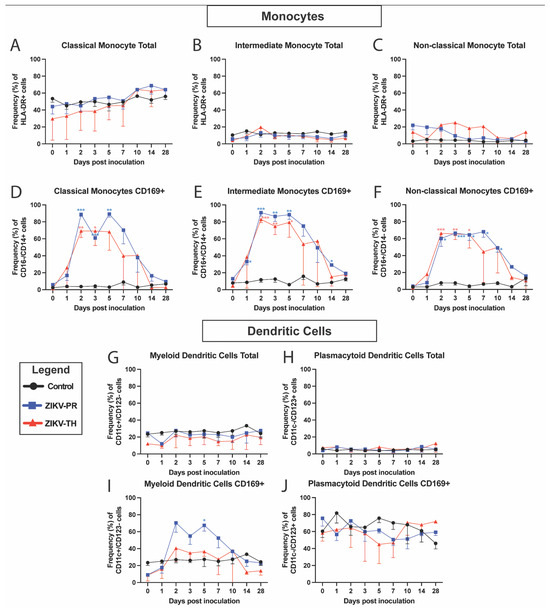 Myeloid dendritic cells were also activated (CD169) in ZIKV-PR with a peak at 2 dpi before returning to baseline by 10 dpi (Figure 3G,I). Plasmacytoid dendritic cells showed no changes in the activation status. ZIKV-TH animals had no activation in either group. There were no significant changes to the total frequencies of either dendritic cell population for any cohorts (Figure 3H,J).