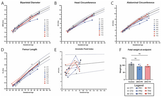 Fetal growth measured through ultrasound, amniotic fluid index, and fetal weight. Longitudinal ultrasound measurements of fetal growth across gestation including (A) Biparietal Diameter (BPD), (B) Head Circumference (HC), (C) Abdominal Circumference, and (D) Femur length in the six ZIKV-infected fetuses with control animals (n = 3) in gray, ZIKV-PR (n = 3) in blue, and ZIKV-TH (n = 3) in red plotted against historical controls, from ONPRC published data used to calculate the logarithmic regression for 50th percentile (black solid line) and for 10th and 90th percentiles, respectively (dashed lines). (E) Amniotic Fluid Index data were obtained by standard measurement of four quadrants and plotted against historical control with the logarithmic regression representing for 50th percentile (black solid line) and for 5th and 95th percentiles, respectively (dashed lines). (F) Fetal weight at necropsy (~GD 90) was measured in grams and analyzed using a one-way ANOVA (ns = p > 0.05) in GraphPad Prism v10.2.