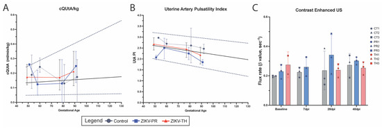 Uteroplacental hemodynamics. Uterine artery (UtA) Doppler measurements and calculations were performed using standard practices. Shown is the linear regression for the 50th percentile (solid line) and for 5th and 95th percentiles, respectively (dashed lines), based upon ONPRC historical data. (A) UtA blood flow (cQtA/kg) corrected for maternal body weight was calculated using the UtA diameter, maternal UtA cross-sectional area and volume of blood flow through the maternal UtA. (B) Doppler measurements were also used to calculate the UtA Pulsatility Index (PI). Graphs show averaged measurements and gestational ages for control animals (gray), ZIKV-PR (blue), and ZIKV-TH (red). (C) Contrast-enhanced ultrasound (CE-US) was used to measure the microvascular flux rate from control, ZIKV-PR, and ZIKV-TH groups, stratified across days post-infection.