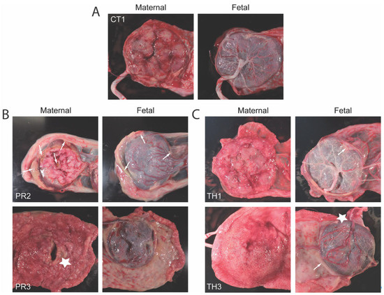 Although the uteroplacental hemodynamics were not significantly different between strains, placental characteristics were also monitored at necropsy. Many groups have shown placental pathology, including infarctions, decreased blood flow, and vasculitis induced by ZIKV-PR, but little is known about ZIKV-TH. On gross pathology, ZIKV-TH cohort had sporadic signs of infarction and white blood cell infiltration when compared to gestationally matched controls, shown by white arrows and stars, respectively (Figure 6). This was more prominent in the ZIKV-PR cohort, which is consistent with our previous work [38]. Following necropsy, the placental cotyledons or perfusion domains were mapped for ZIKV positivity using qPCR on 3–5 pooled villous samples. All the animals that had detectable placental viral RNA also all had higher levels of the virus detected in maternal tissues (Table 2). This finding highlights that both strains are associated with widespread dissemination and fetal transmission.