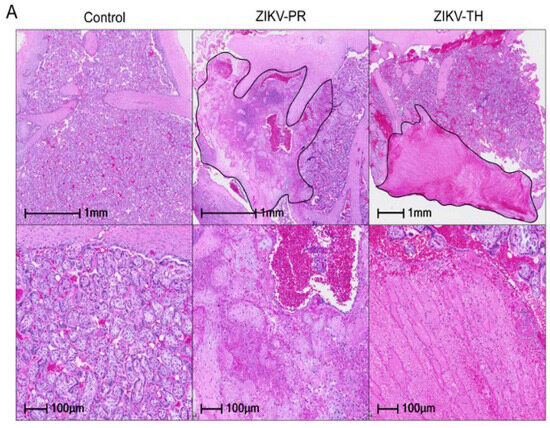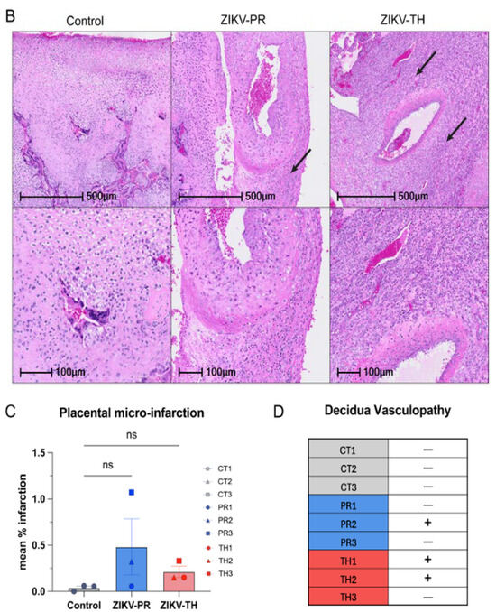 Once mapped, two sections from each cotyledon were formalin-fixed and paraffin-embedded before staining with H&E. Slides were analyzed for signs of infarction, vasculitis, and additional pathology. Compared with sham negative controls, a three-fold increase in infarction frequency was observed in the ZIKV-PR inoculated group, which supports the gross pathology images (Figure 7A,C). Control animals exhibited little to no signs of infarction on gross pathology or histology. Decidual spiral artery leukocytoclastic vasculitis with evidence of spiral artery remodeling was identified in one of ZIKV-PR cases and two of ZIKV-TH cases (Figure 7B,D). Taken together with our previous findings, which suggested ZIKV-PR’s potential to induce placental damage and impact fetal outcomes, this study provides further evidence supporting the strain’s association with placenta damage.