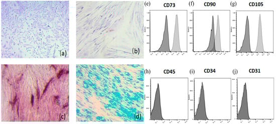 Differentiation of MSC-PL. Briefly the first criterion for the characterization is morphology, (a) the MSC-PL monolayer was stained with Toluidine blue to highlight the fibroblastoide shape (magnification 5×), and the second criterion is the differentiation process, (b) adipogenic differentiation was indicated by accumulation of neutral lipid vacuoles that were stained with Oil Red O (magnification 20×). (c) Osteogenic differentiation was indicated by alkaline phosphatase detection (magnification 20×). (d) Chondrogenic differentiation was indicated by chondrogenic matrix colored with Alcian Blue (magnification 20×). The cell-surface molecule characteristics of MSC-PL were analyzed using flow cytometry. Positives markers: (e) CD73; (f) CD90; and (g) CD105. Negative markers: (h) CD45; (i) CD 34; and (j) CD 31.