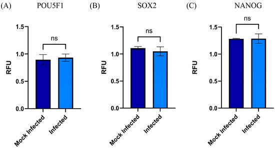 MSC-PL stemness biomarkers. The mRNA expression of the transcription factors (A) POU5F1, (B) SOX2, and (C) NANOG, were analyzed using RT-qPCR with the MyGo Mini System. The analysis was performed in RSV-infected MSC-PLs. Mean values were tested for significance using the Mann–Whitney test. All results were considered significant when p ≤ 0.05, ns (not statistically significant). The mock-infected cells were analyzed in parallel.