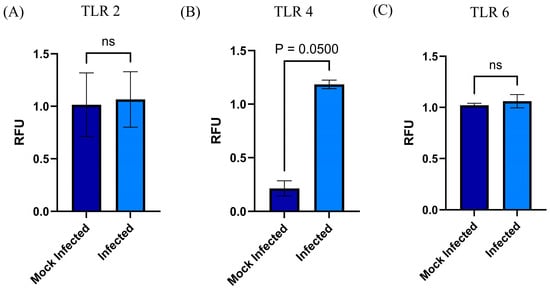 Changes in the expression of TLRs by MSC during RSV infection. The mRNA expressions of (A) TLR 2, (B) TRL 4, and (C) TLR 6 were analyzed by RT-qPCR with the MyGo Mini System. The analysis was performed in RSV-infected MSC-PLs. Mean values were tested for significance using the Mann–Whitney test. All results were considered significant when p ≤ 0.05, ns (not statistically significant). The mock-infected cells were analyzed in parallel.