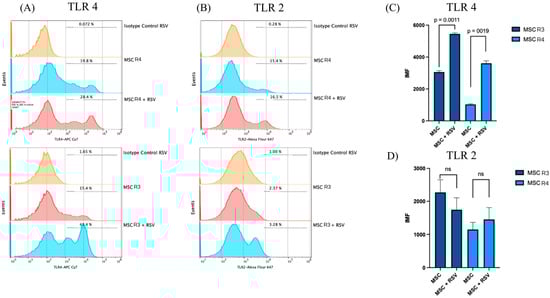 Flow cytometry analysis of TLR4 and TLR2 expressions in MSCs at R3 and R4, with and without RSV infection. Representative histograms show the percentage of TLR4-positive cells (A) and TLR2-positive cells (B) in MSCs at R3 and R4, under control conditions and after infection with respiratory syncytial virus (RSV). Isotype controls are shown in orange. The bar graphs represent the mean fluorescence intensity (MFI) for TLR4 (C) and TLR2 (D) in MSC R3 and R4, with and without RSV infection. Statistical analysis was performed using an unpaired t-test.