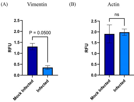 Modification of pattern of mRNA expression of (A) vimentin and (B) actin in MSC-PL during RSV infection. The mRNA expressions of the actin and vimentin were analyzed by RT-qPCR with the MyGo Mini System. The analysis was performed in RSV-infected MSC-PLs. Mean values were tested for significance using the Mann–Whitney test. All results were considered significant when p ≤ 0.05, ns (not statistically significant). The mock-infected cells were analyzed in parallel.
