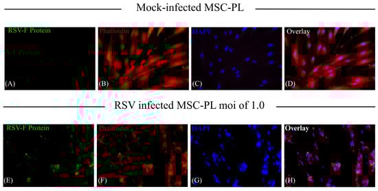 Rearrangement of actin filaments in RSV-infected MSC-PLs. Briefly described, the MSC-PLs were infected with RSV at a moi of 1 over 72 h. The RSV infection and the actin filaments were visualized using immunofluorescence assay. The RSV F viral protein was detected with commercial mABs (antiF0-F1), and the secondary antibody corresponds to anti-mouse-FITC: (A) mock-infected and (E) RSV-infected MSC-PLs. The detection of filamentous actin was performed by direct labeling with Phalloidin TRIC Labeled: (B) mock-infected and (F) RSV-infected MSC-PLs. For the visualization of cell nuclei, the samples were incubated with 4’, 6-Diamidino-2-phenylindole (DAPI): (C) mock-infected and (G) RSV-infected MSC-PLs. Overlay of anti-F (anti-mouse-FITC in green) and actin fibers (Phalloidin TRIC Labeled in red): (D) mock-infected and (H) RSV-infected MSC-PLs.
