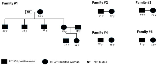 During the course of the investigation, it was possible to pinpoint other family members who were included in the present study for screening and confirmation. Family #1 was identified with eight members that tested positive for HTLV-1; the index case was a man (37 y). Family clusters were detected among four other families (#2, #3, #4, and #5) with the occurrence of infection among couples, suggesting that sexual intercourse was the main route of transmission. Unfortunately, it was not possible to detect infection among the children of these couples. (Figure 1). Furthermore, intrafamilial transmission could not be investigated for the only individual infected with HTLV-2.
