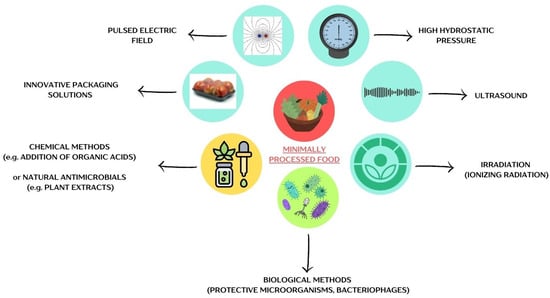 To guarantee the safety and high quality of minimally processed foods, the food industry is advancing various preservation techniques. Common methods include thermal and non-thermal processing, refrigerated storage, innovative packaging solutions (modified atmosphere packaging, controlled atmosphere packaging, edible coatings), the application of natural antimicrobials or chemicals, and the use of hurdle technology [,,].