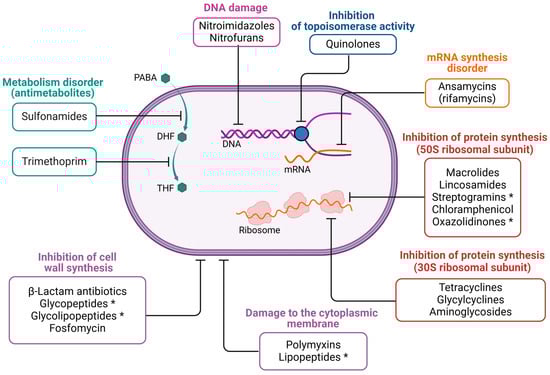 The mechanism of action of selected drug groups. The figure was created in BioRender. Wójcicki, M. (2025) https://BioRender.com/r74m836, accessed on 27 May 2025 (license no.: KO27XLU1BJ). Symbols in the figure: PABA—p-aminobenzoic acid; DHF—dihydrofolate; THF—tetrahydrofolate. The asterisk (*) indicates antibiotics that are active only against Gram-positive bacteria.