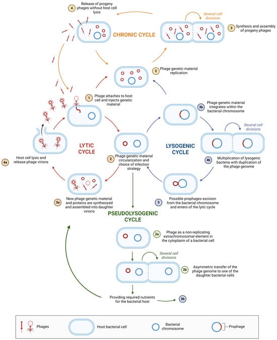 Environmental factors, as well as the physiological and genetic traits of the bacterial host, can lead to variations in phage replication pathways []. Phage replication strategies exist on a spectrum, from highly productive infections that result in the release of new virions to persistent nonproductive infections that do not generate new phages but instead spread prophage genomes within the bacterial population (transferred from parent to daughter cells) [,]. The two most well-known and studied phage replication pathways are the lytic and lysogenic cycles [,]. A variation of the lysogenic cycle is the carrier state, also known as the pseudolysogenic cycle []. Another form of phage–host interaction is chronic infection [,]. Figure 4 illustrates the differences between these various phage infection strategies.