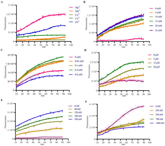Effect of different conditions on 2C helicase activity. (A) Effect of divalent metal ions on 2C helicase activity. (B) Effect of Mg2+ concentration on 2C helicase activity. (C) ATP concentration-dependent helicase activity of 2C protein. (D) Protein concentration effect on 2C helicase activity. (E) Substrate (dsDNA) concentration-dependent helicase activity. (F) Effect of competitor DNA strand concentration on 2C helicase activity.