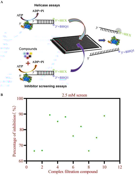 HTS for inhibitors of FMDV 2C helicase. (A) Schematic representation of a customized compound library screened for 2C inhibitors using a FRET-based helicase assay in a 384-well plate format. Green asterisks (*) represent the HEX fluorophore; purple asterisks (*) denote the BHQ1 quencher. (B) Compounds with high inhibition from the initial screening results were re-screened utilizing 2.5 mM (inhibition rate > 60%).