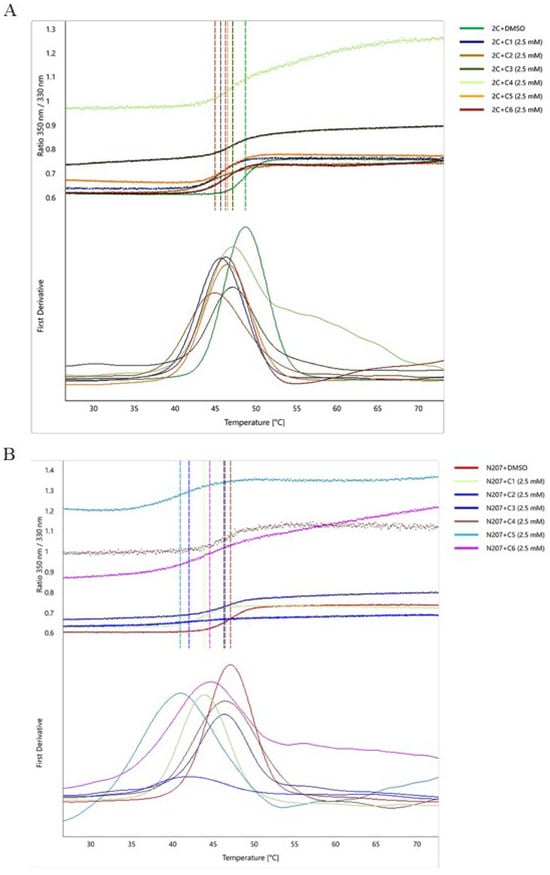 Analysis of Tm value changes in the interaction of small molecule ligands with 2C and mutant N207A. (A,B) The upper half is the 350 nm/330 nm ratio after the endogenous fluorescence change during thermal stabilization. The lower half is the first order derivative corresponding to the upper half, and the temperature corresponding to the vertical line at the inflection point is the Tm value. (A) Thermal stability profiles of 2C protein interacting with six small molecule compounds (2.5 mM). (B) Thermal stability profile of mutant protein N207A interacting with six small molecule compounds (2.5 mM).
