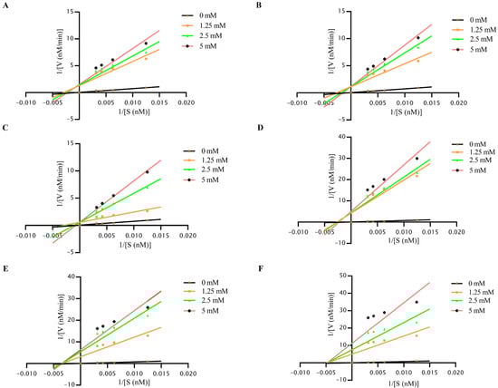 Lineweaver-Burk plot analysis of inhibition of 2C helicase activity. (A) The linearity between 1/V and 1/S for 2-MPO small molecule at 0, 1.25, 2.5 and 5 mM concentrations, respectively. (B) The linearity between 1/V and 1/S for 5-TzS− small molecule at 0, 1.25, 2.5 and 5 mM concentrations, respectively. (C) The linearity between 1/V and 1/S for 2-PyOH small molecule at 0, 1.25, 2.5 and 5 mM concentrations, respectively. (D) The linearity between 1/V and 1/S for MPPI small molecule at 0, 1.25, 2.5 and 5 mM concentrations, respectively. (E) The linearity between 1/V and 1/S for DCMQ small molecule at 0, 1.25, 2.5 and 5 mM concentrations, respectively. (F) The linearity between 1/V and 1/S for Spiro-BD-CHD-dione small molecule at 0, 1.25, 2.5 and 5 mM concentrations, respectively.