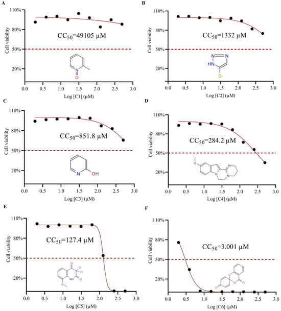 Analysis of small molecule compounds on BHK-21 cytotoxicity. (A) The toxicity analysis of BHK-21 by 2-MPO. (B) The toxicity analysis of BHK-21 by 5-TzS−. (C) The toxicity analysis of BHK-21 by 2-PyOH. (D) The toxicity analysis of BHK-21 by MPPI. (E) The toxicity analysis of BHK-21 by DCMQ. (F) The toxicity analysis of BHK-21 by Spiro-BD-CHD-dione. The horizontal coordinate corresponding to the intersection of the red dashed line with the solid line represents the logarithmic value of the corresponding inhibitor concentration at 50% cell activity. The portion under the red dashed line shows the 2D structure of the small molecule compound.
