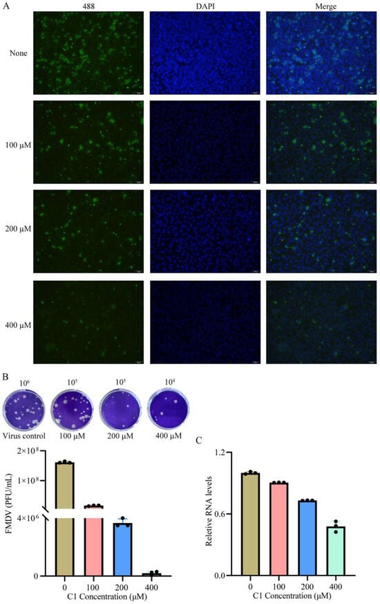FMDV inhibitory activity was evaluated via plaque reduction, indirect immunofluorescence (IFA), and qRT-PCR. Cells seeded in 24-well plates reached 80% confluency before infection (MOI = 0.1, 1.5 h). After washing the cells with PBS, serially diluted compounds in virus maintenance medium were added. After 36 h incubation, supernatants were processed for the plaque assay, while cells were either fixed with methanol for IFA or lysed with TRIzol® reagent for viral RNA quantification by qRT-PCR with virus-specific primers.