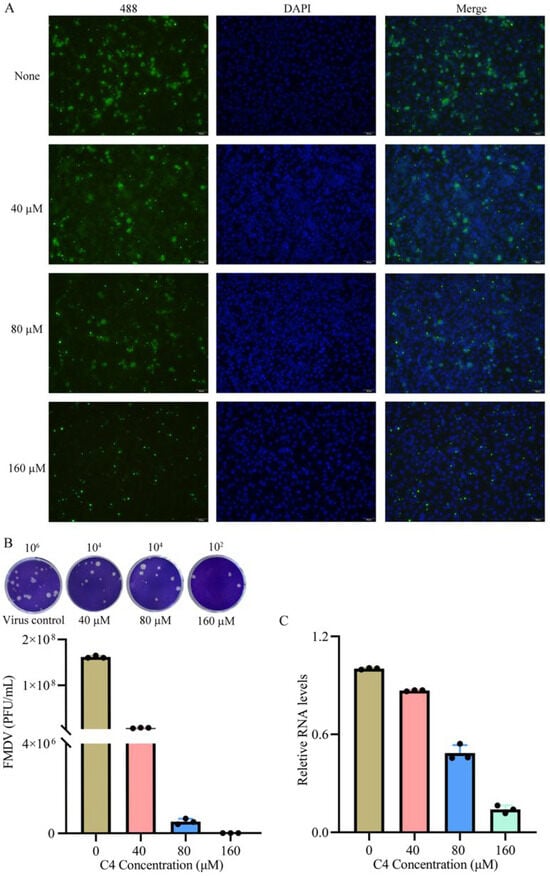 Effect of MPPI compound on FMDV replication in BHK-21 cells. (A) BHK-21 cells were inoculated with FMDV and treated with different concentrations of MPPI (40, 80, and 160 μM). For the indirect immunofluorescence assay, the primary antibody used was rabbit anti-FMDV polyclonal antibody, detected with Alexa Fluor 488-conjugated goat anti-rabbit IgG secondary antibody (emission: 519 nm). All experiments were performed in triplicate. Nuclei were counterstained with DAPI. Scale bars: 100 μm. (B) MPPI inhibited FMDV culture supernatant titers were determined by the plaque assay. (C) Viruses in infected cells treated with different concentrations of compounds (MPPI) were detected by RT-qPCR.