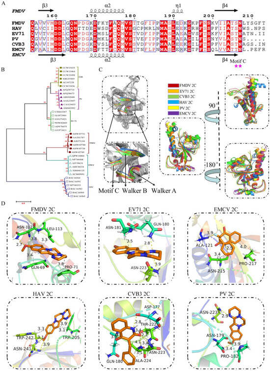 Based on picornavirus 2C amino acid sequence and structure analysis. (A) Amino acid sequence alignment analysis based on the structural analysis of the picornavirus 2C protein. 2C helicase key structural domain Motif C is marked with a red star. Blue boxes indicate that all amino acids within the same column exhibit a high degree of conservation. (B) Analysis of the amino acid genetic evolutionary tree of some picornavirus 2C proteins. (C) Structural comparison of FMDV 2C (red) with EV 71 (orange), CVB3 (green), HAV (blue), PV (yellow), and EMCV (purple). Left: The gray structure illustrates the spatial arrangement of Walker A, Walker B, and Motif C within the structural context of picornavirus 2C. Upper right side: The overlapping structure is rotated 90° clockwise on the Y-axis. Lower right side: The overlapping structure is rotated 180° clockwise on the Y-axis. (D) FMDV, EV 71, CVB3, HAV, PV, and EMCV 2C structures with the molecular docking results for C4 compounds. The brownish-yellow portion shows small molecule compounds with binding amino acid residue sites where the yellow bonds are hydrogen bonds and the gray bonds are hydrophobic interaction bonds.