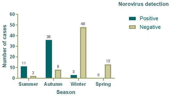 Distribution of positive and negative cases for norovirus by season in children under five years of age.