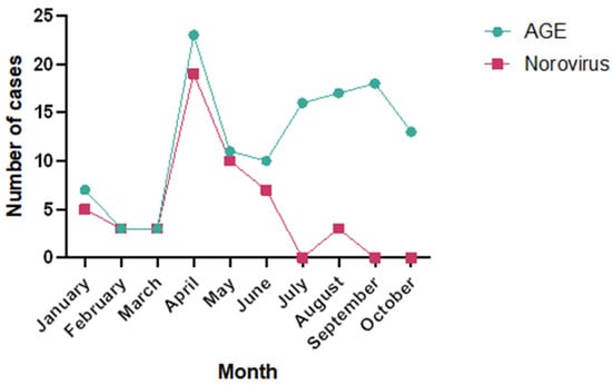 The frequency of stool samples collected from children under five years old with AGE varied throughout the year. Norovirus was detected most frequently in April (19 cases), followed by May (10 cases) and June (7 cases), corresponding to the autumn season in Chile (Figure 1). Notably, the first half of the year (summer and autumn) accounted for the highest percentage of norovirus-positive samples (94%) (Table 1), specifically in April (38%) and May (20%), where the highest percentage of positive cases occurred (Figure 2). On the other hand, the highest number of all AGE cases occurred during the winter months (Figure 2). However, during this period, the presence of pathogens other than norovirus, including rotavirus, Clostridioides difficile, and adenovirus, was detected using immunochromatography assays.