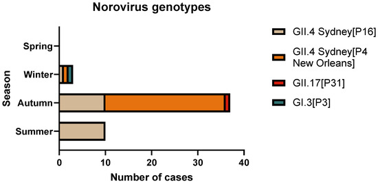 Among the 50 norovirus-positive samples, 49 (98%) were positive for GII and 1 (2%) for GI. Dual genotyping demonstrated that 54% of the samples were typed as GII.4 Sydney[P4 New Orleans], followed by GII.4 Sydney[P16] (42%), GII.17[P31] (2%), and GI.3[P3] (2%) (Table 3). During the summer months, GII.4 Sydney[P16] was the only type detected, while during the autumn months there was greater variation in circulating genotypes with the presence of GII.4 Sydney[P4 New Orleans] (70.3%), GII.4 Sydney[P16] (27%) and GII.17[P31] (2.7%) (Figure 3).