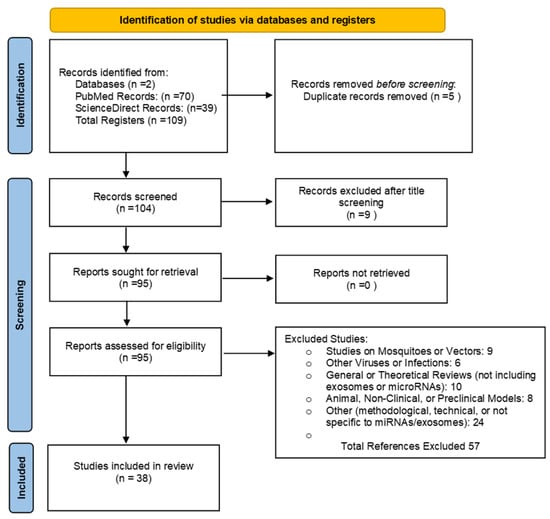 This study employs a narrative review to analyze recent research on the role of extracellular vesicles (EVs) in the pathogenesis of severe dengue. The review aims to address the following research question: What is the role of extracellular vesicles (EVs) in dengue pathogenesis, and how can they contribute to understanding vascular permeability, plasma leakage, immune evasion, and the development of clinically relevant biomarkers and therapeutic strategies? To robustly address this question using relevant and up-to-date evidence, we conducted a comprehensive literature search in two databases, ScienceDirect and PubMed, following the guidelines of the Preferred Reporting Items for Systematic Reviews and Meta-Analyses (PRISMA) framework []. The search strategy was based on the following equation: (‘Extracellular Vesicles’ OR ‘Exosomes’ OR ‘Microvesicles’ OR ‘microRNAs’) AND (‘Dengue’ OR ‘Severe Dengue’). To enhance the sensitivity and specificity of the search, we incorporated Medical Subject Headings (MeSH) terms. The detailed methodology is illustrated in Figure 1. Additionally, to update data related to the epidemiology and general characteristics of the viral infection, the following search terms were used: (‘Dengue’ OR ‘Severe Dengue’ OR ‘Dengue Hemorrhagic Fever’) AND (‘Epidemiology’).