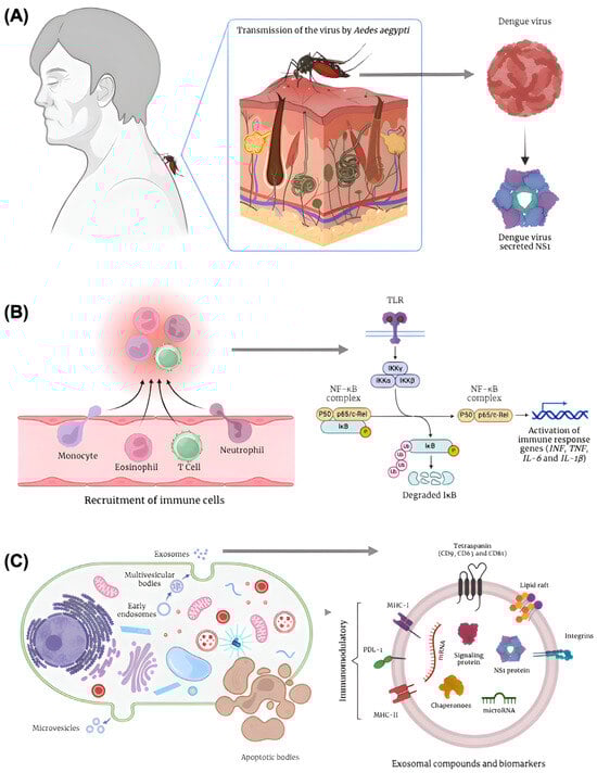 Impact of dengue virus infection—Role of the NS1 Protein, Immune Signaling, and Extracellular Vesicles: (A) Dengue transmission occurs through the bite of the Aedes aegypti mosquito, the vector of the dengue virus, a positive-sense single-stranded RNA virus belonging to the genus Flavivirus. The virus encodes the non-structural protein 1 (NS1), a multifunctional glycoprotein essential for viral replication and pathogenesis, contributing to endothelial dysfunction and immune modulation. (B) Following viral infection, a signaling cascade is activated, involving the recruitment of immune cells and increased vascular permeability. This response induces cytoskeletal alterations, oxidative stress, and inflammatory signaling mediated by the activation of Toll-like receptors (TLRs). These receptors ultimately lead to the activation of the inflammatory pathway regulated by nuclear factor kappa B (NF-κB), promoting the immune response and the transcription of related genes such as interferons (INF), tumor necrosis factor (TNF), and interleukins (IL-6 and IL-1β). (C) Immunologically active cells may undergo apoptosis, releasing apoptotic bodies, or activate paracrine signaling pathways mediated by extracellular vesicles, including exosomes. These exosomes transport RNA, microRNAs, and the viral NS1 protein itself, playing an immunomodulatory role through receptors such as MHC-I, MHC-II, and PDL-1. These mechanisms contribute to the propagation of inflammatory signaling and the modulation of the immune response during dengue virus infection. Figure created using BioRender.com.