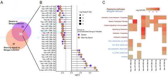 Analysis of circulating miRNAs in dengue infection (GSE150623) reveal 30 miRNAs differentially expressed (|LogFC| > 2 and Adjusted p-value < 0.05) mutually in severe and warning signal cases compared to dengue infection without signs. (A) Venn diagram of deMIRs of commom regulation between severity. (B) List of common deMIRs and its expression in both groups compared to uncomplicated dengue infection. (C) En-richment pathways of deMIRs.