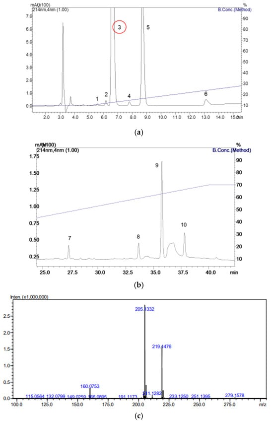 Chromatographic profile of Rhinella schneideri skin secretion obtained in C18 column and collection of peak 3, correspondent to bufotenine: (a) 0 to 15 min gradient; (b) 25 to 40 min gradient; (c) mass spectrometry analysis of peak 3 (highlighted in panel (a)).