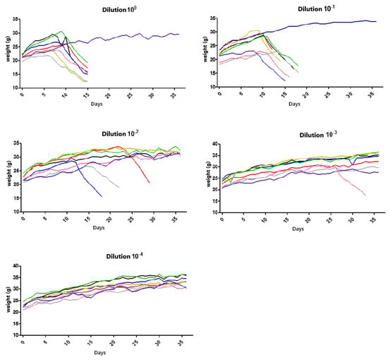 Animals were observed for 36 days after virus inoculation. The most evident clinical sign was weight loss, shown in Figure 3, which depicts several virus dilutions. It was observed that the animals’ weights significantly decreased after approximately 15 days, when exposed to the highest concentrations. In contrast, no weight change was noted in the animals treated with the 104 dilution even after 36 days (Figure 3).