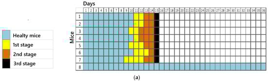 The characterization of stages of the infection over time is depicted in Figure 4, after an intradermal injection of the virus, showing a successful model for the disease.