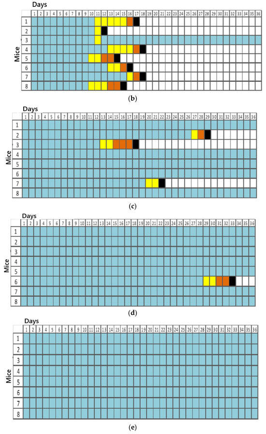 Clinical manifestation of the disease induced in mice, with the IP1972/16 virus model (injected in the paw), according to its dilution: (a) 100 dilution, (b) 10−1 dilution, (c) 10−2 dilution, (d) 10−3 dilution, and (e) 10−4 dilution.