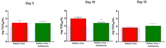 Virus titers on animal serum based on days after inoculation and comparison of inoculation of rabies virus and treatment with bufotenine 5, 10, and 15 days after inoculation. * p < 0.01.