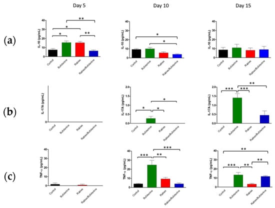 IL-17A was undetectable in the rabies control serum but appeared on day 15 in the rabies/bufotenine group. In the CNS, IL-17 levels remained more stable in the bufotenine-treated group compared to the rabies-only group. IL-17 is a pro-inflammatory cytokine implicated in autoimmune and infectious diseases and may disrupt blood–brain barrier integrity by downregulating tight junction proteins [].