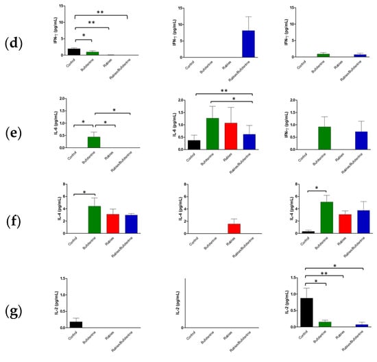 Cytokine quantification in mice CNS after rabies virus or rabies virus plus treatment with bufotenine. (a) IL-10. (b) IL-17A. (c) TNF-α. (d) IFN-γ. (e) IL-6. (f) IL-4. (g) IL-2. * (p ≤ 0.05), ** (p ≤ 0.01).