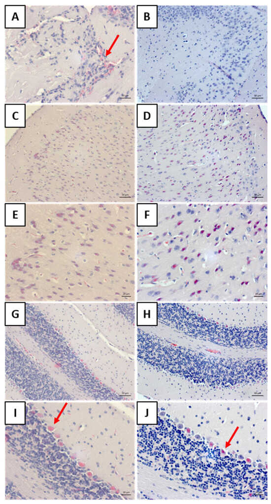 The histology of the CNS stained with hematoxylin and eosin (HE). (A) The meningeal region of the rabies group and (B) the rabies group treated with bufotenine. The red arrow indicates the region with inflammatory infiltrate. (C,E) The cortical region of the rabies group. (D,F) The cortical region of the rabies group treated with bufotenine. (G,I) The cerebellum of the rabies group. (H,J) The rabies group treated with bufotenine. The red arrow indicates the presence of anucleate eosinophilic Purkinje cells.