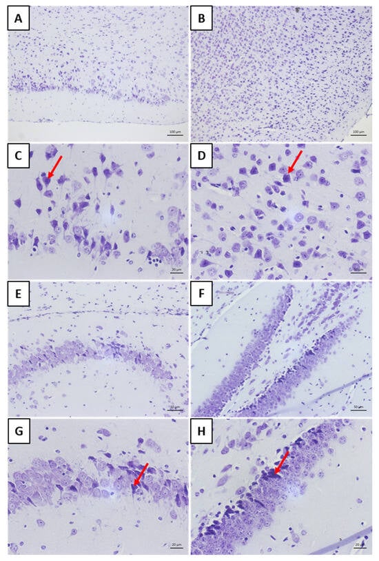 Cresyl violet staining enabled a more detailed evaluation of neuronal degeneration in the cortical and hippocampal regions (Figure 10). When compared to the bufotenine-treated group, animals with rabies showed a higher number of degenerated neurons (Figure 10A,E,G—rabies group; Figure 10B,D,F,H—bufotenine-treated group). Furthermore, a quantitative analysis revealed a marked reduction in the total number of neurons in the cerebral cortices of rabies-infected animals compared to the bufotenine-treated group (Figure 10A—rabies group; Figure 10B—bufotenine-treated group).