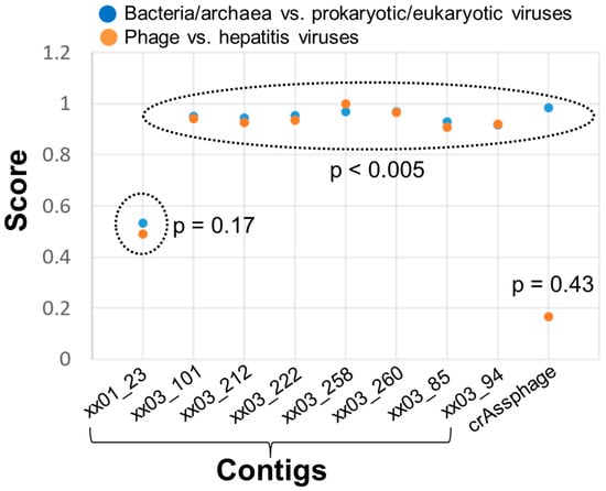 Serum virome sequencing generated an average of 4.89 ± 0.34 million reads per case. Viral categorization revealed the existence of known human viruses, including anelloviruses and phages. As expected, no known hepatitis viruses were detected in any of the nine patients in the discovery cohort. A total of 28,243 reads remained after subtractive mapping and which were assembled into 5370 contigs. Subsequent annotation identified unknown sequences of only eight contigs: one from Patient 1, and the other seven from Patient 3 (Supplementary Table S1). These eight contigs had no hits in any similarity-based searches at either the nucleotide or amino acid level. Machine-learning analysis revealed contig xx01_23 from Patient 1 to have a score of around 0.5 in both models, and such a score is not indicative of viral origin. However, all seven contigs from Patient 3 had scores above 0.9, regardless of the model applied (Figure 1). Interestingly, the score of crAssphage dropped significantly in the phage/hepatitis virus model, suggesting that k-mer frequency differs between phage and hepatitis virus genomes.
